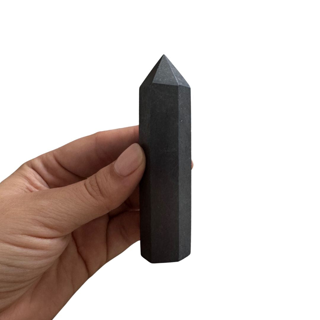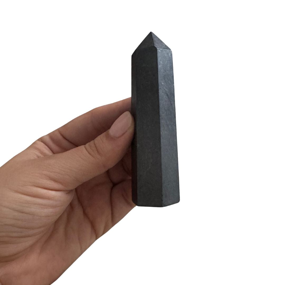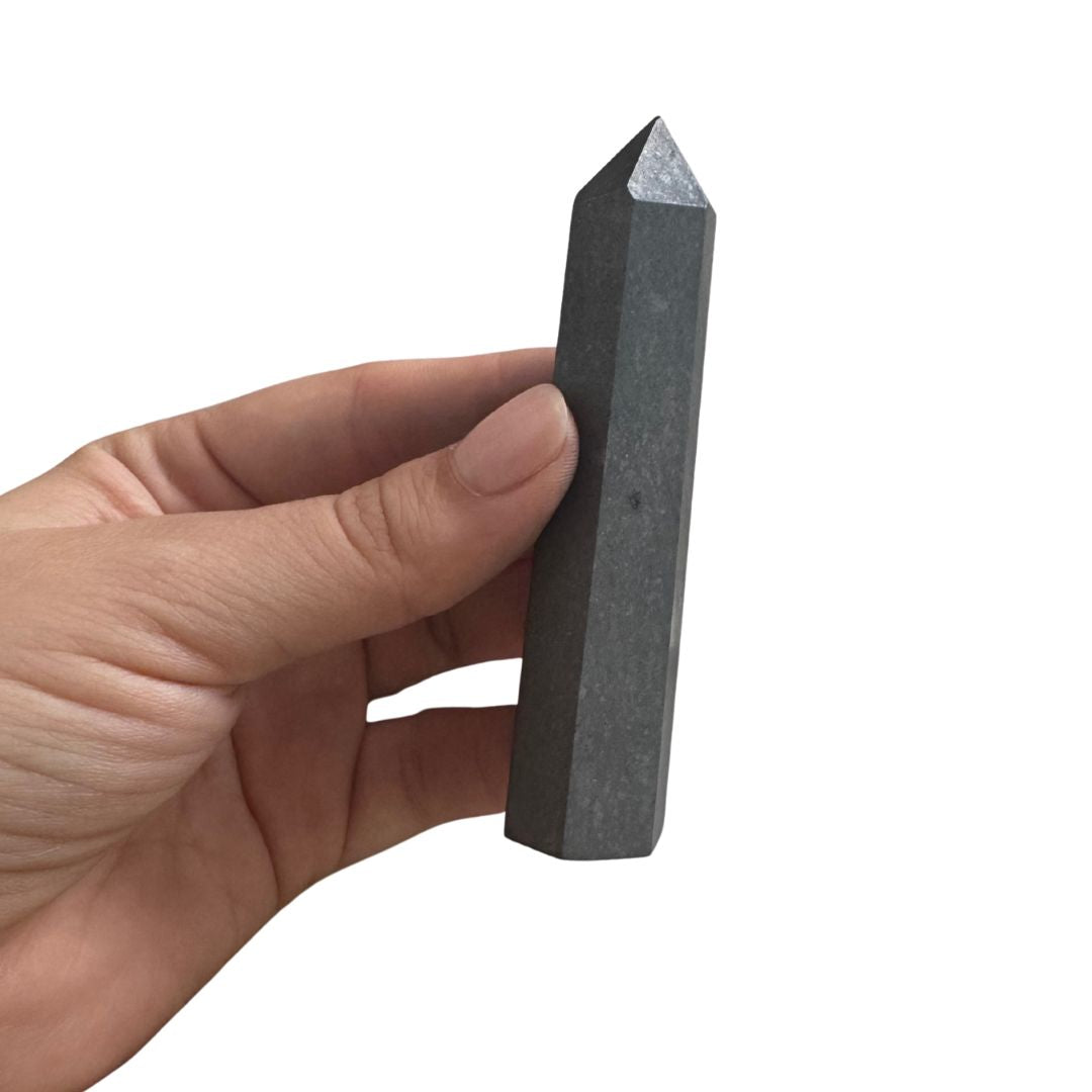Shungita torre en punta, en forma de obelisco para que puedas incluirla como parte de tu decoración.