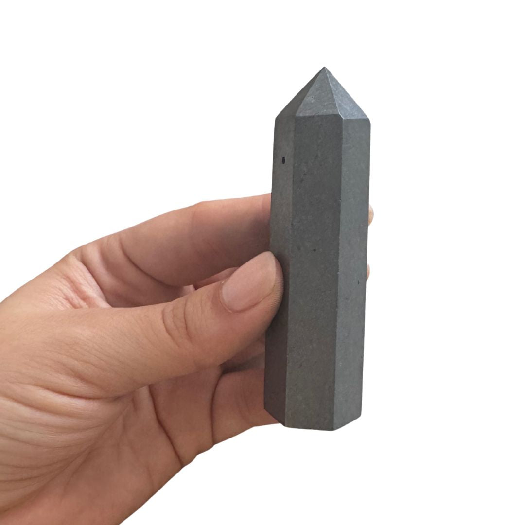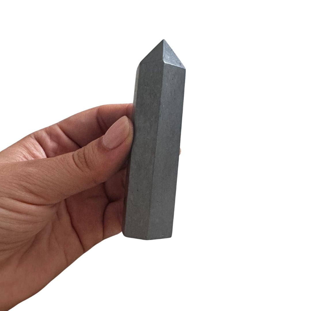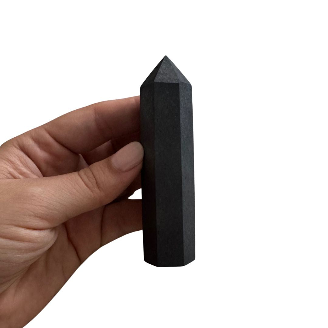 Shungita torre en punta, en forma de obelisco para que puedas incluirla como parte de tu decoración.